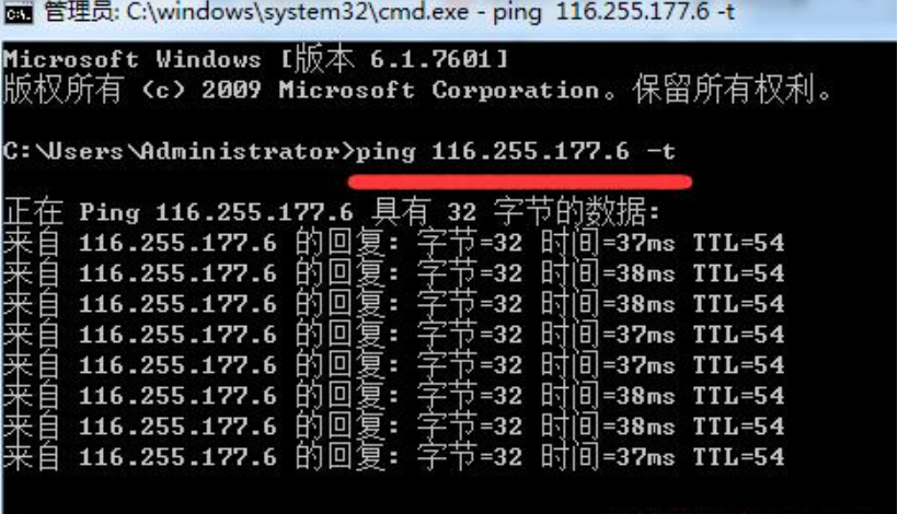 2、在CMD窗口中,输入ping IP或域名 -t,如下图所示,可看到这台VPS的PING值,PING值小,说明服务器的响应速度快,反之PING值大,响应速度慢。