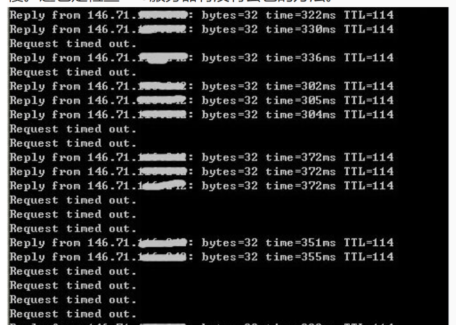 3、若出现如下图所示的 Request timed out,说明有丢包,线路或服务器有问题,速度会变慢。这也是检查VPS服务器有没有丢包的方法。