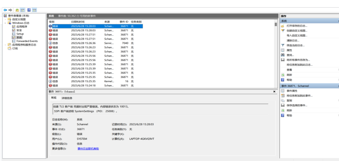 Windows11操作系统运行iNode智能客户端在建立SSL VPN隧道连接时,系统日志频繁提示“创建 TLS 客户端 凭据时发生严重错误。