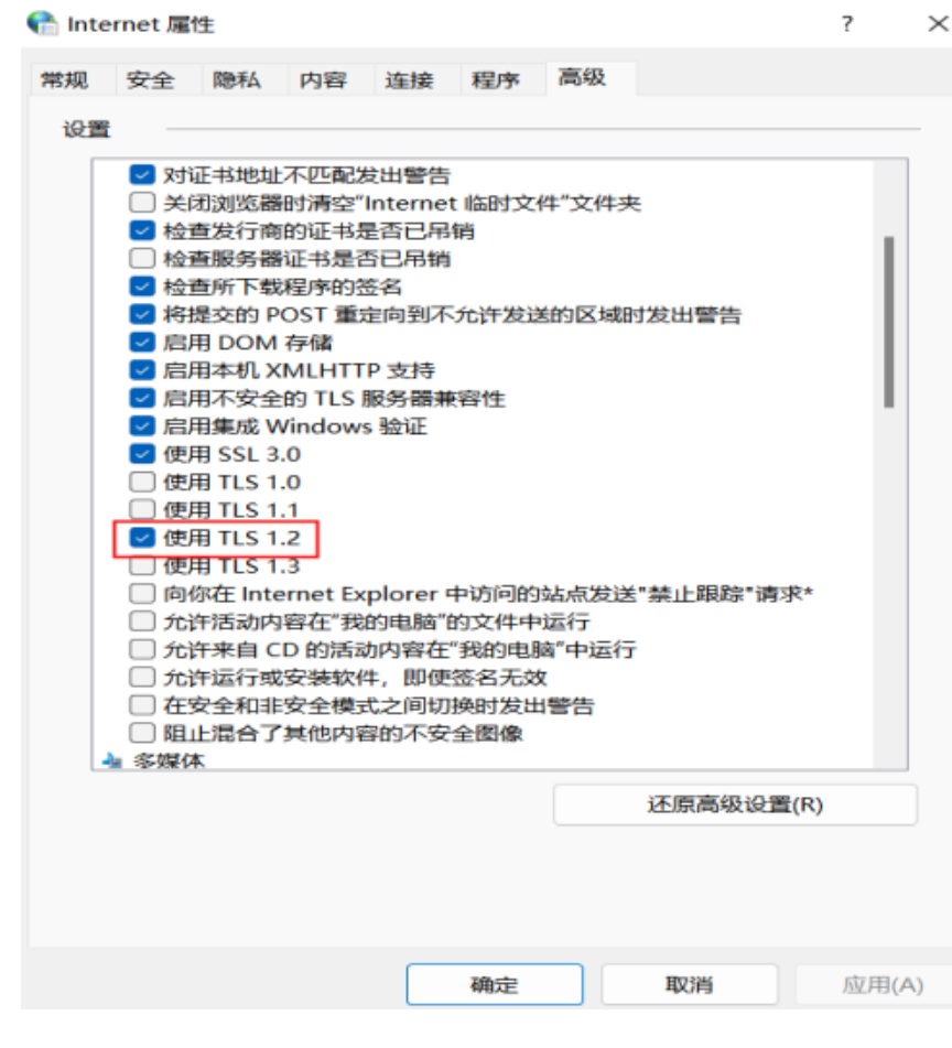 4. 选择“Internet选项”,切换到“高级”选项卡,TLS仅勾选“TLS1.2”