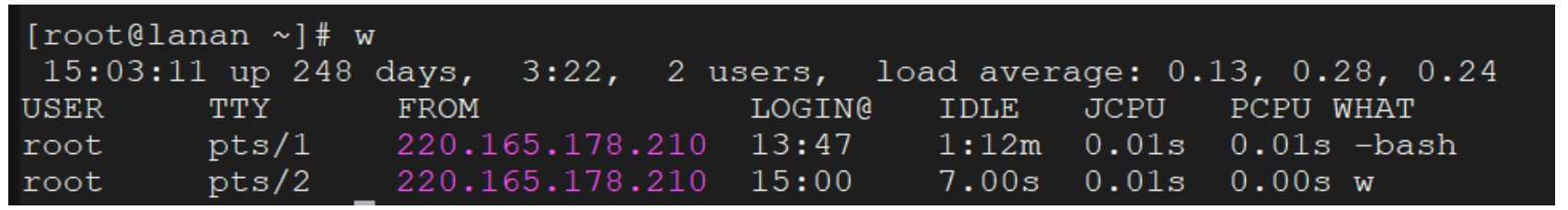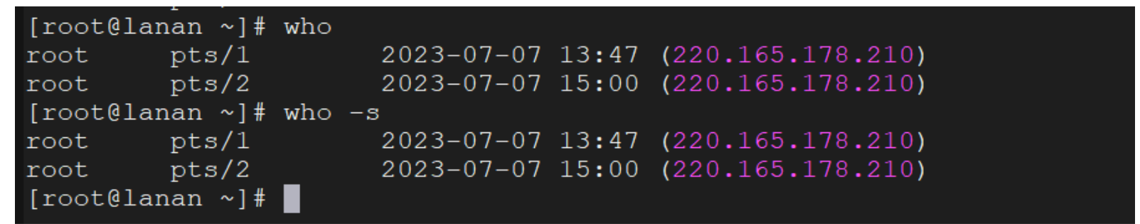 相比较 w 命令,who 命令只能显示当前登陆的用户信心,但无法知晓每个用户正在执行的命令。