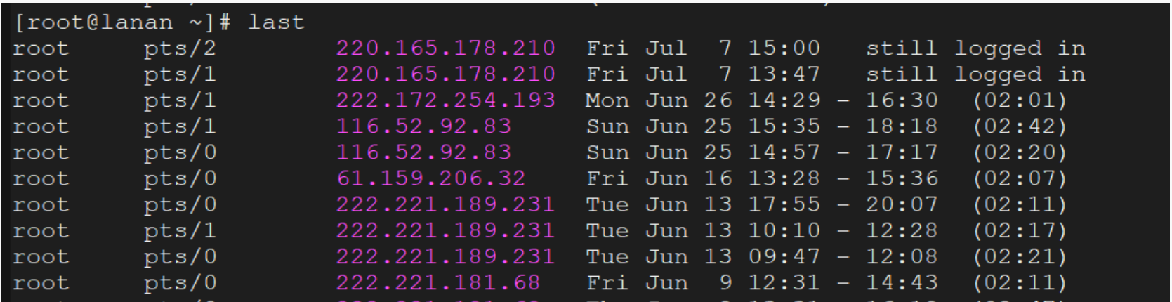 二、使用last 或lastlog命令可以查看原先登录的用户现在已经退出登录的用户信息,last命令可以查看当前和过去登陆系统用户的相关信息;lastlog 命令可以查看到每个系统用户最近一次登陆系统的时间。last 命令,此命令的基本格式如下所示: