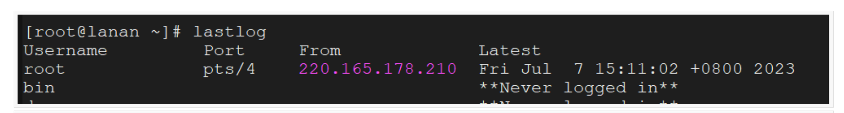 再来看看 lastlog 命令,此命令可以查看登陆过当前系统用户的最近一次登陆时间,比如: