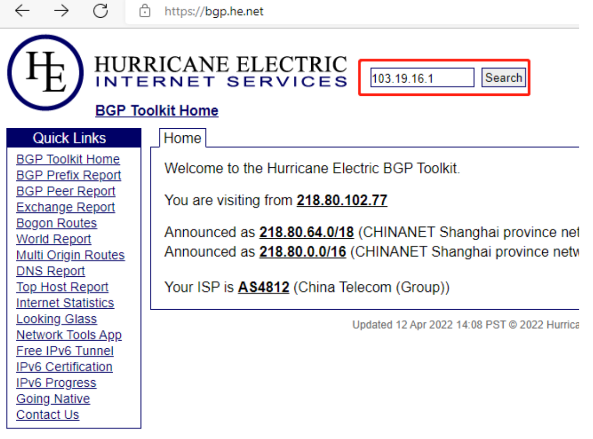 访问 https://bgp.he.net/ ,在顶部搜索栏中输入要查询的IP地址。