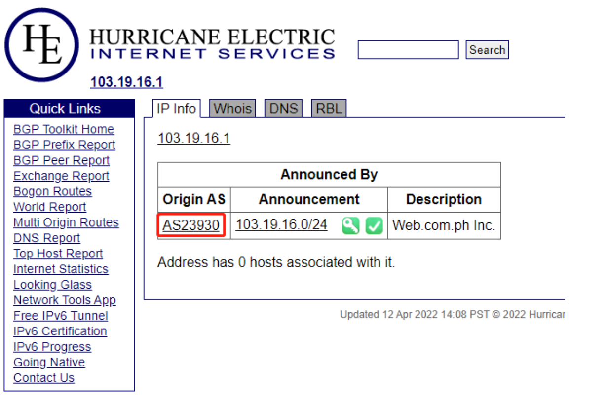 在查询结果页面,点击ASN编号。ASN(Autonomous System Number)是为每个大型网络分配的编号,该编号全球唯一。