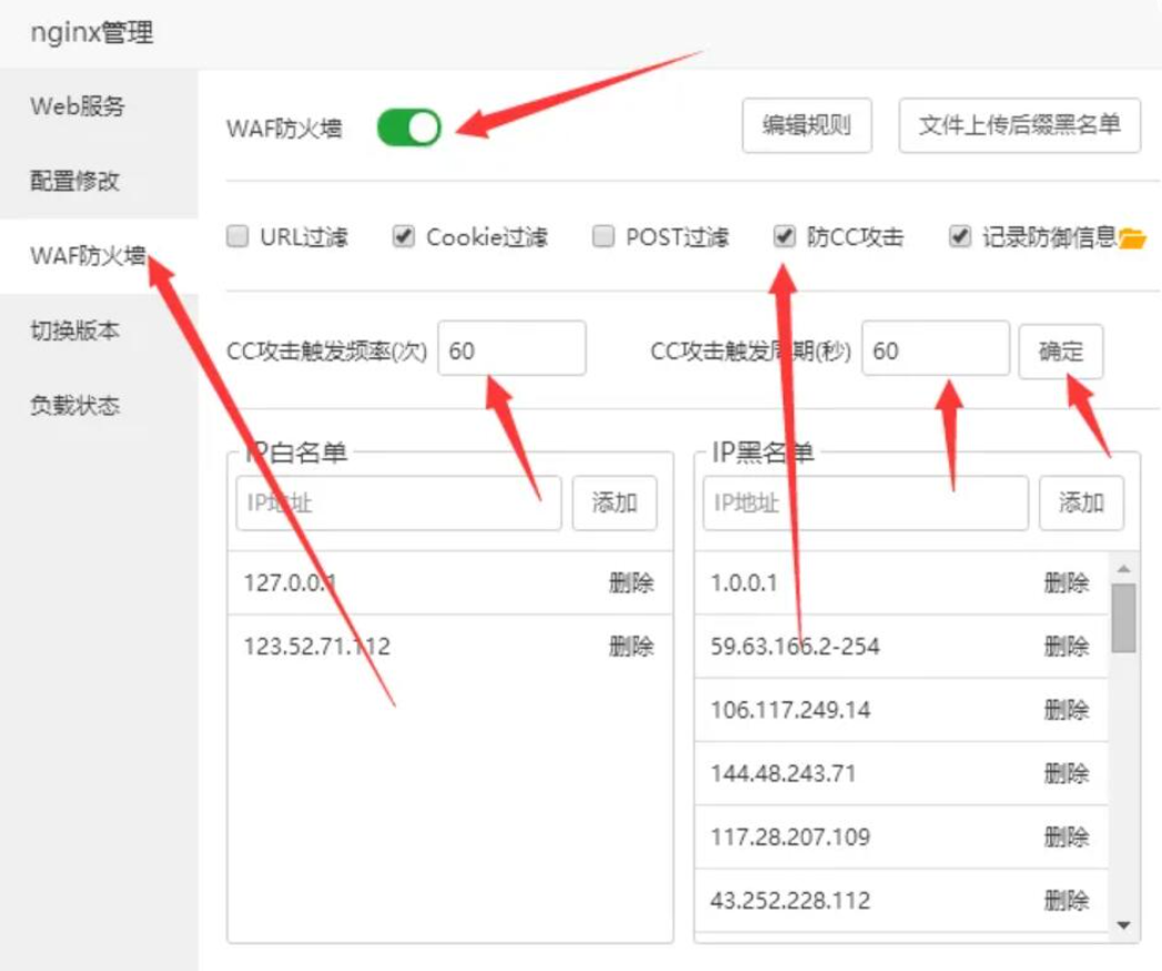 打开nginx 设置,里面有waf防火墙。(要求nginx为1.12版本)如下图: