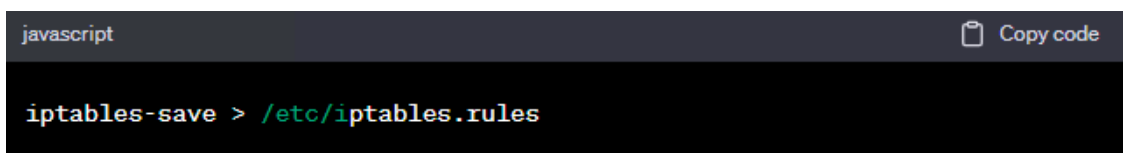 4.保存 iptables 规则: 在重新启动后,iptables 规则将会丢失,因此需要将规则保存到一个文件中。使用以下命令保存 iptables 规则: