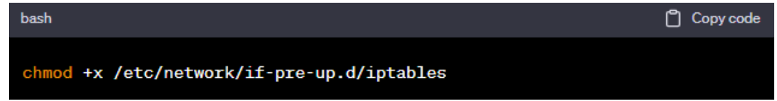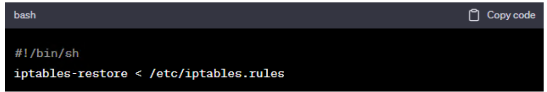 5.自动加载 iptables 规则: 创建一个启动脚本,以在系统引导时加载保存的 iptables 规则。创建一个文件 /etc/network/if-pre-up.d/iptables,并添加以下内容: