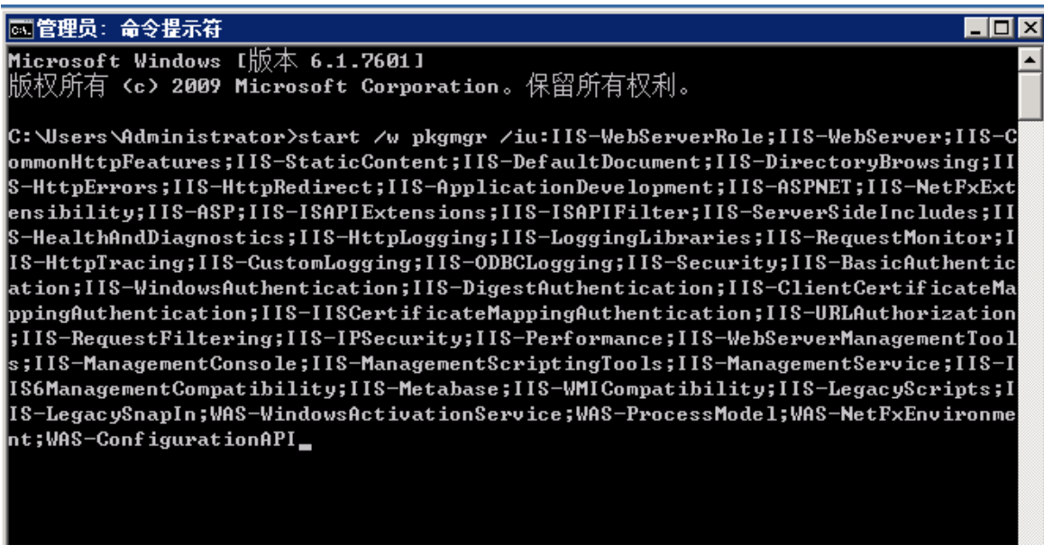 打开cmd,输入命令:start /w pkgmgr/iu:IIS-WebServerRole;IIS-WebServer;IIS-CommonHttpFeatures;IIS-StaticContent;IIS-DefaultDocument;IIS-DirectoryBrowsing;IIS-HttpErrors;IIS-HttpRedirect;IIS-ApplicationDevelopment;IIS-ASPNET;IIS-NetFxExtensibility;IIS-ASP;IIS-ISAPIExtensions;IIS-ISAPIFilter;IIS-ServerSideIncludes;IIS-HealthAndDiagnostics;IIS-HttpLogging;IIS-LoggingLibraries;IIS-RequestMonitor;IIS-HttpTracing;IIS-CustomLogging;IIS-ODBCLogging;IIS-Security;IIS-BasicAuthentication;IIS-WindowsAuthentication;IIS-DigestAuthentication;IIS-ClientCertificateMappingAuthentication;IIS-IISCertificateMappingAuthentication;IIS-URLAuthorization;IIS-RequestFiltering;IIS-IPSecurity;IIS-Performance;IIS-WebServerManagementTools;IIS-ManagementConsole;IIS-ManagementScriptingTools;IIS-ManagementService;IIS-IIS6ManagementCompatibility;IIS-Metabase;IIS-WMICompatibility;IIS-LegacyScripts;IIS-LegacySnapIn;WAS-WindowsActivationService;WAS-ProcessModel;WAS-NetFxEnvironment;WAS-ConfigurationAPI