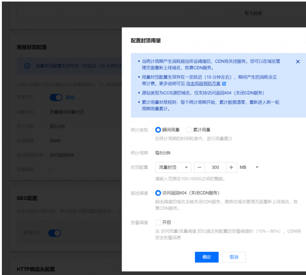 可以配置瞬间用量、带宽用量,带宽突发并不大,因网站流量大小而设置;也可以设置累计用量,每5分钟达到300M就返回404.