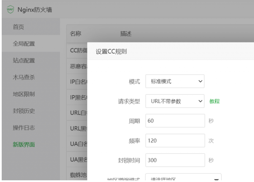 打开Nginx防火墙,选择全局配置>>CC防御规则,如果受到大量攻击,请求类型选择IP,周末设置为10秒10次,这样能防住99%的CC攻击。