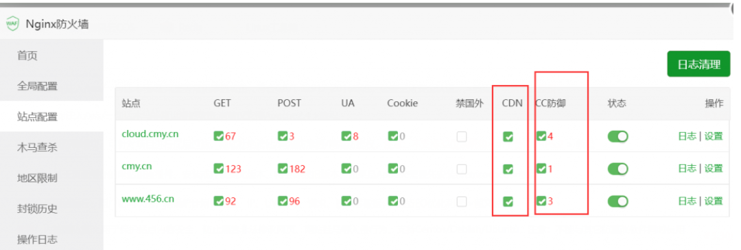 在Nginx防火墙的站点配置里面选中网站,把CC防御框勾选。如果加了CDN,记得把CDN勾选,否则网站无法打开。