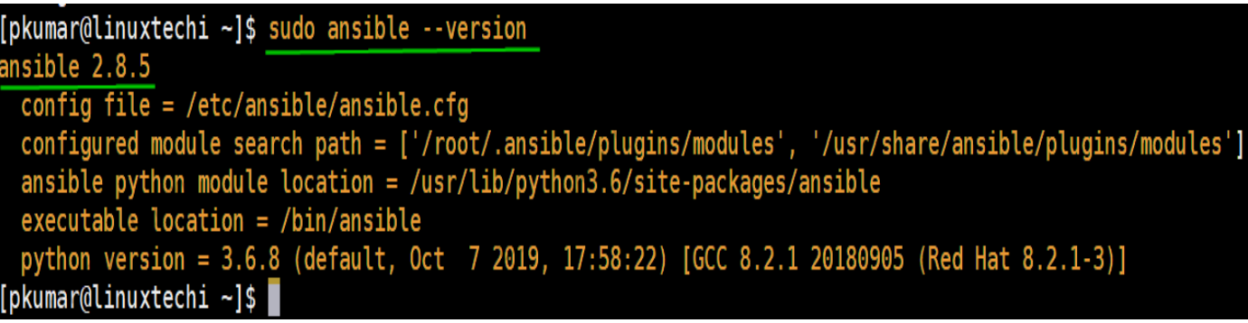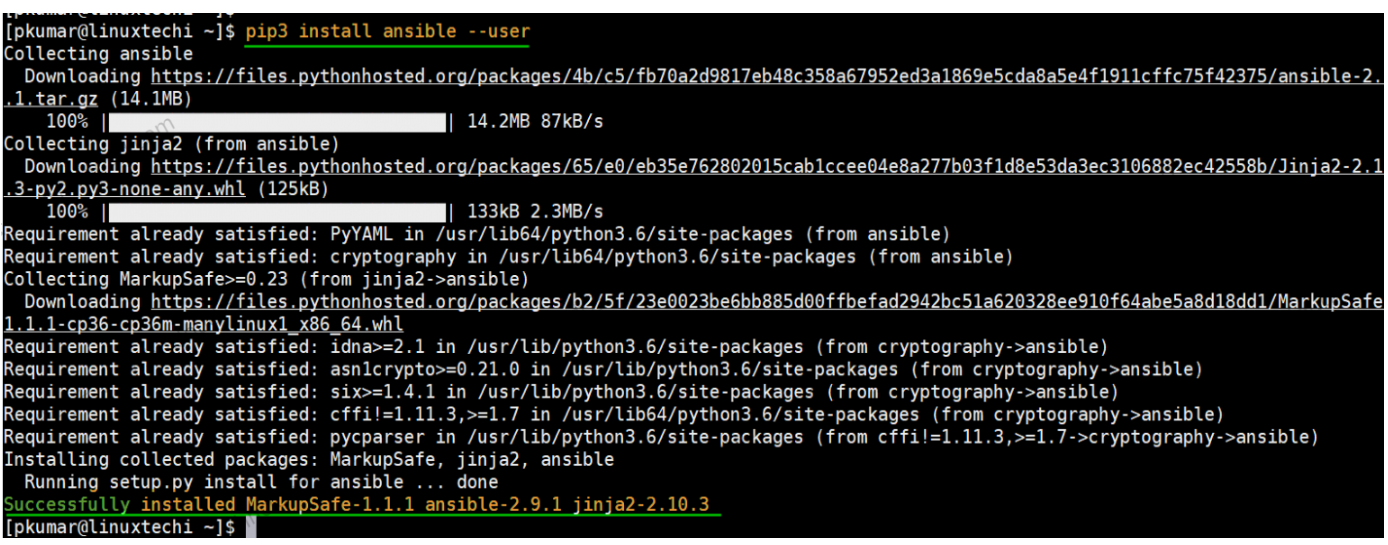 [root@linuxtechi ~]$ pip3 install ansible --user