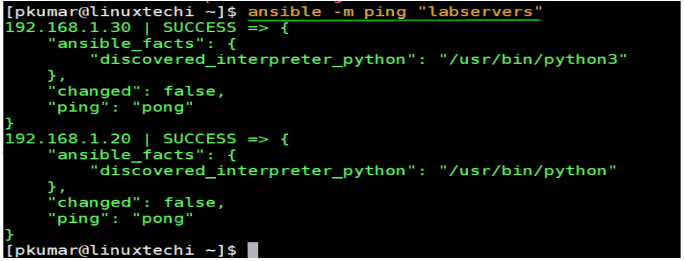 [root@linuxtechi ~]$ ansible -m ping "labservers"