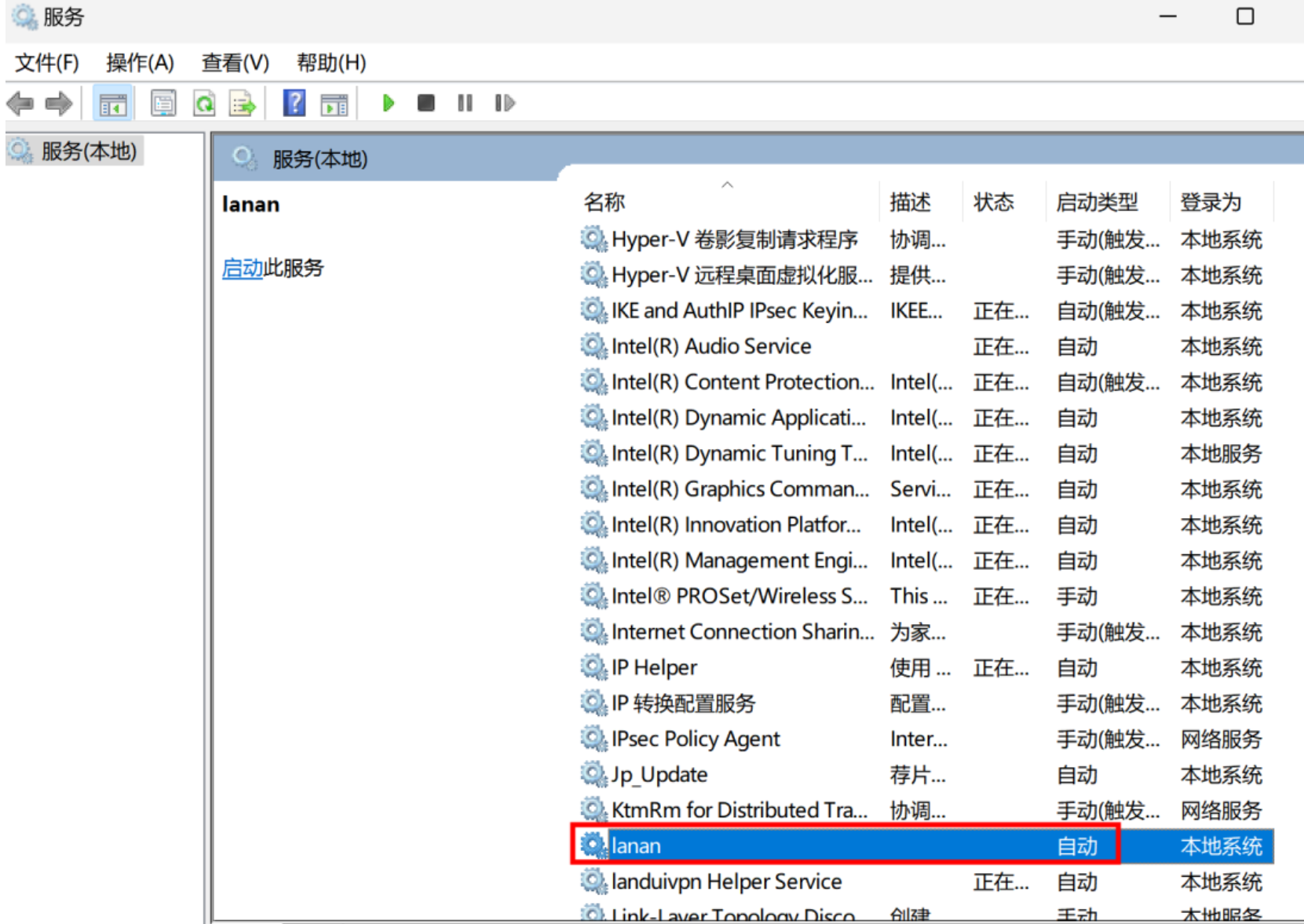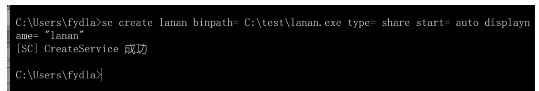 sc create lanan binpath= C:\\test\\lanan.exe type= share start= auto displayname= "lanan"
