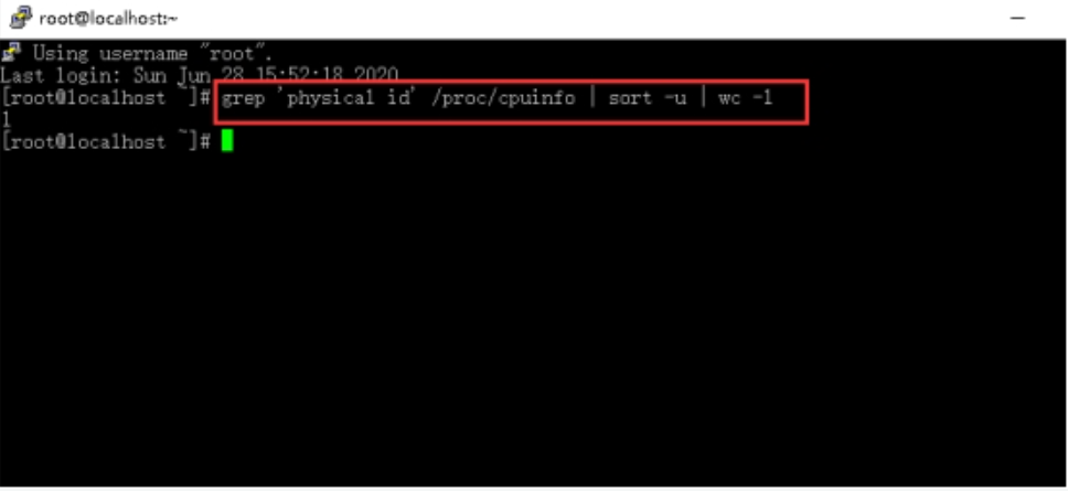 1.输入grep 'physical id' /proc/cpuinfo | sort -u | wc -l查看CPU的个数。