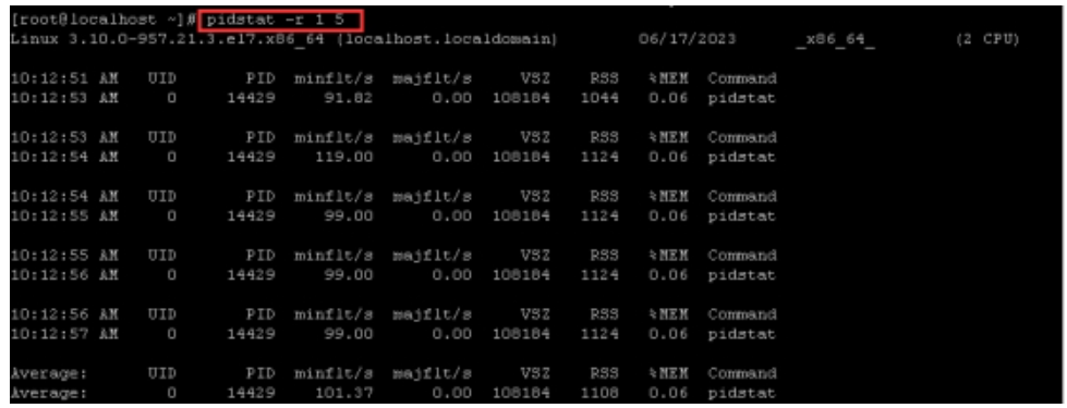 3.pidstat -r 1 5,输入该命令按回车键查看活跃进程的内存使用情况