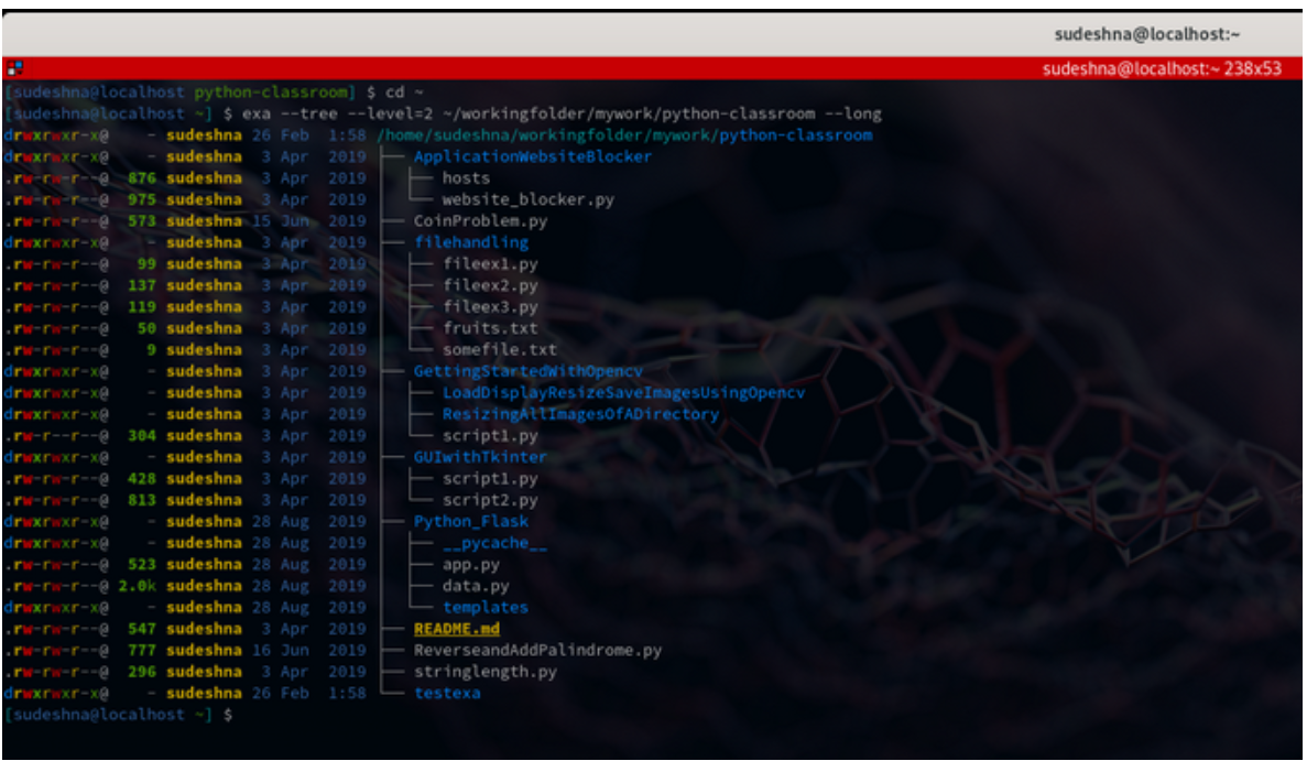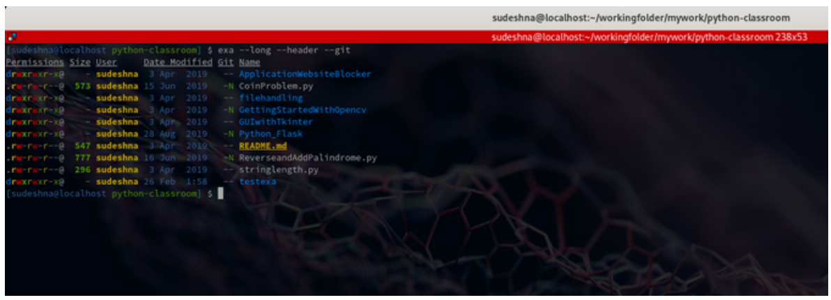我相信 exa 是最简单、适应性最强的工具之一。它帮助我跟踪了很多Git和Maven文件。它的颜色编码让我更容易在多个子目录中搜索,而且它帮助我了解当前的xattrs。