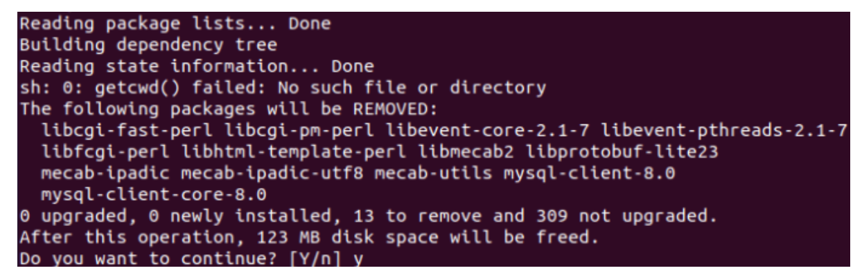 如你所见,它已经删除了3个包含服务器文件的包。我们之所以使用 "清除 "而不是 "删除",是因为前者将程序的配置文件也删除了,而后者只删除了程序的二进制文件。