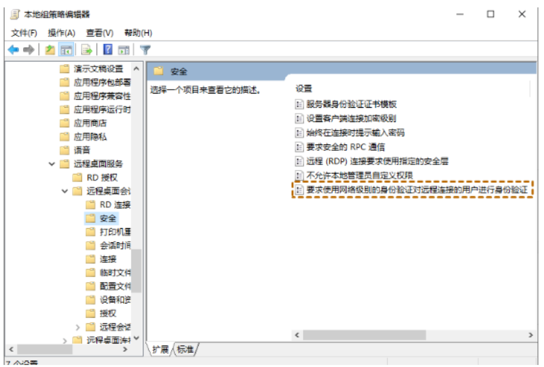 2.跳转到:计算机配置 > 管理模板 > Windows 组件 > 远程桌面服务 > 远程桌面会话主机 > 安全。在右侧窗格中,找到并双击“要求使用网络级别的身份验证对远程连接的用户进行身份验证”。