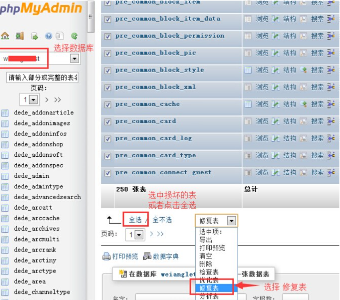 1、使用phpmyadmin进行修复。