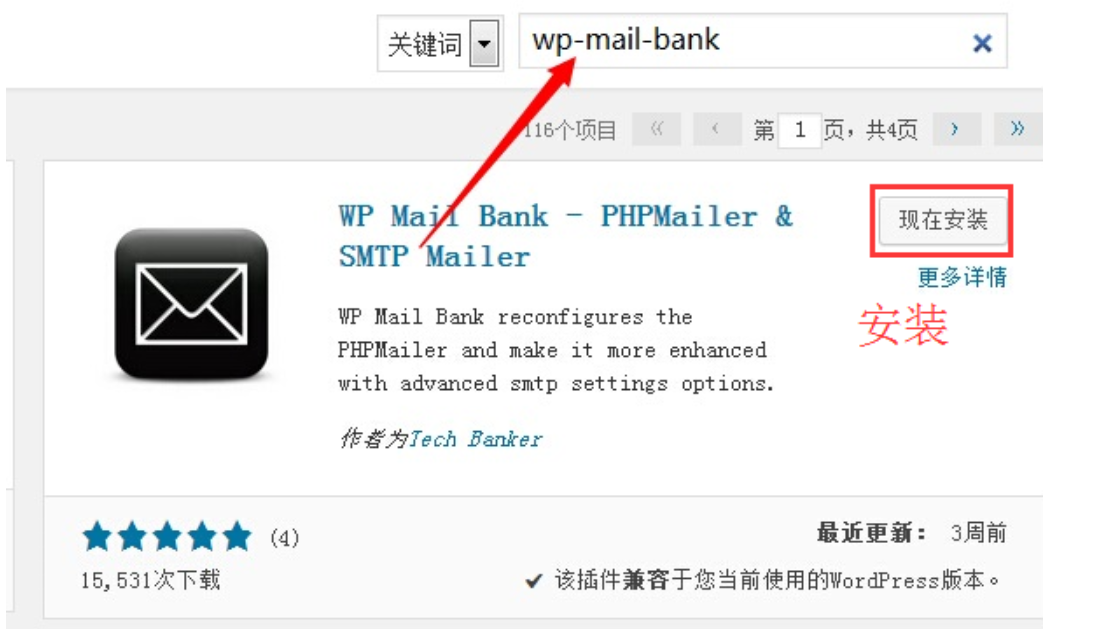 在右上角输入框中输入:WP-Mail-Bank 按回车搜索安装,如图所示