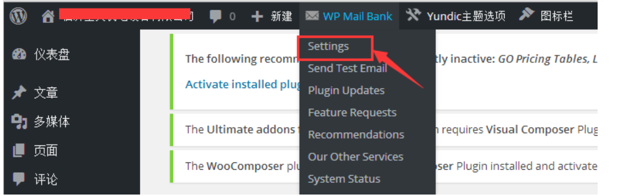 后台顶部点击WP Mail Bank下的setting按钮进入设置。