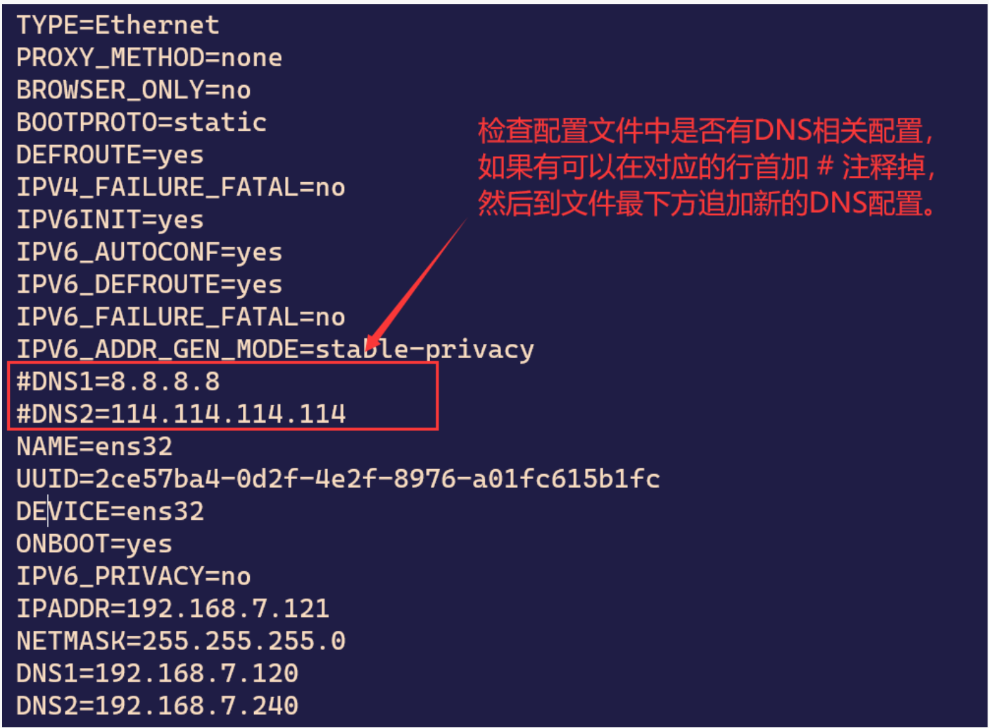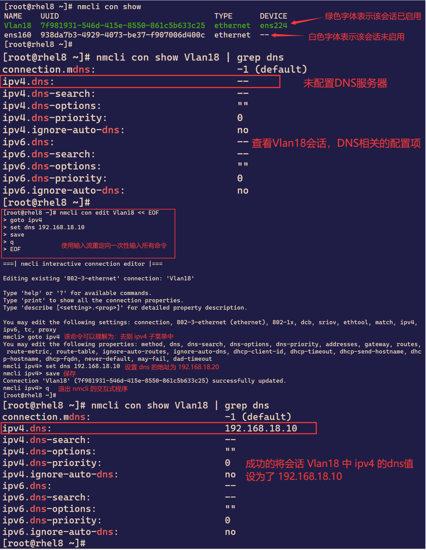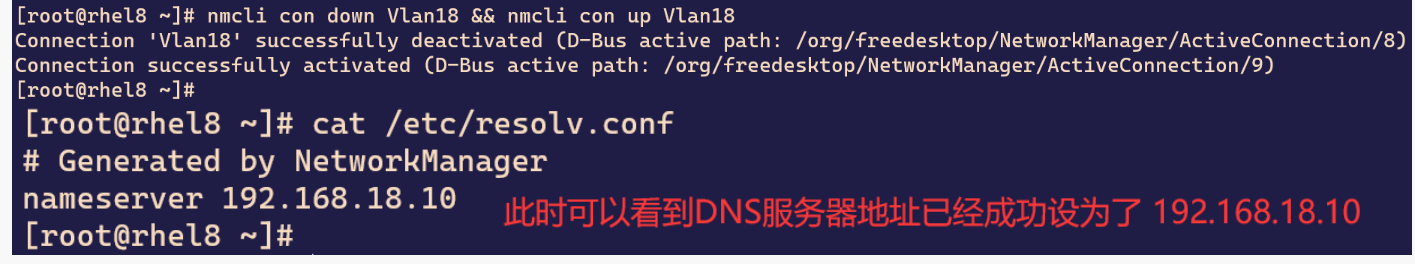 系统默认使用NetworkManager管理网络服务,因此可以使用nmcli这个命令行程序来交互式的配置DNS。