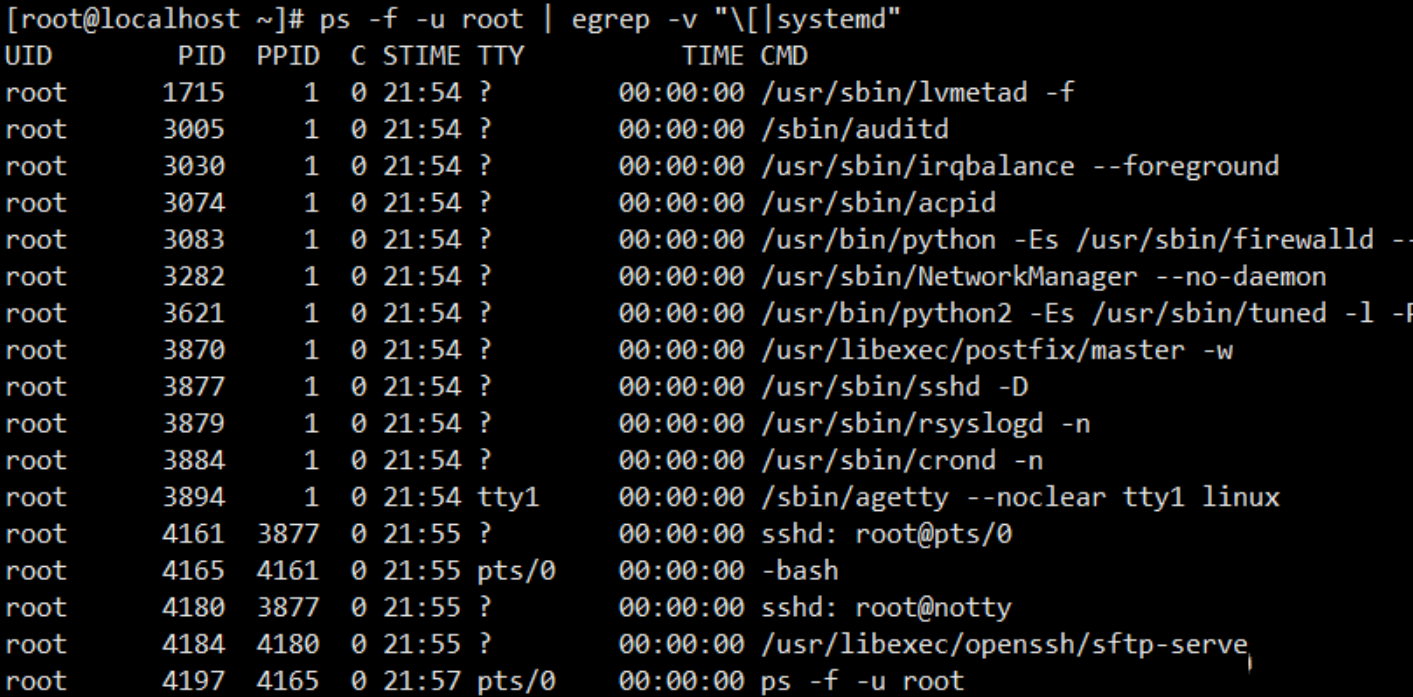 ps -f -u root | egrep -v "\[|systemd"