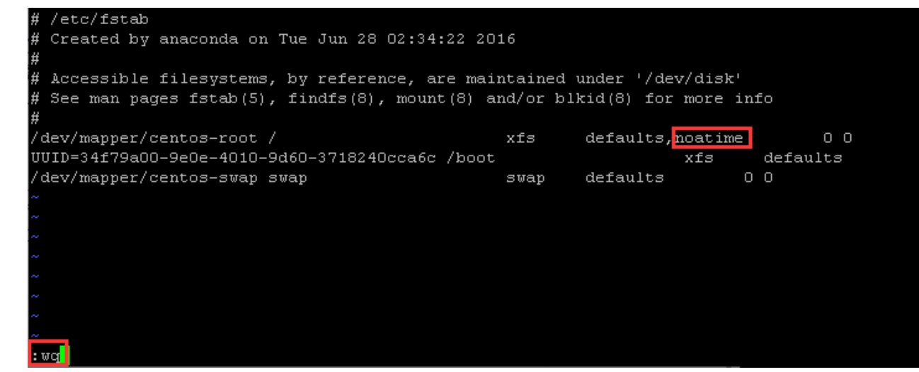 2.按“i”进入插入模式,在如图目录设置对应位置处增加noatime参数,然后按“ESC”键输入wq按回车键保存退出vi编辑。此时需要重启系统使设置生效
