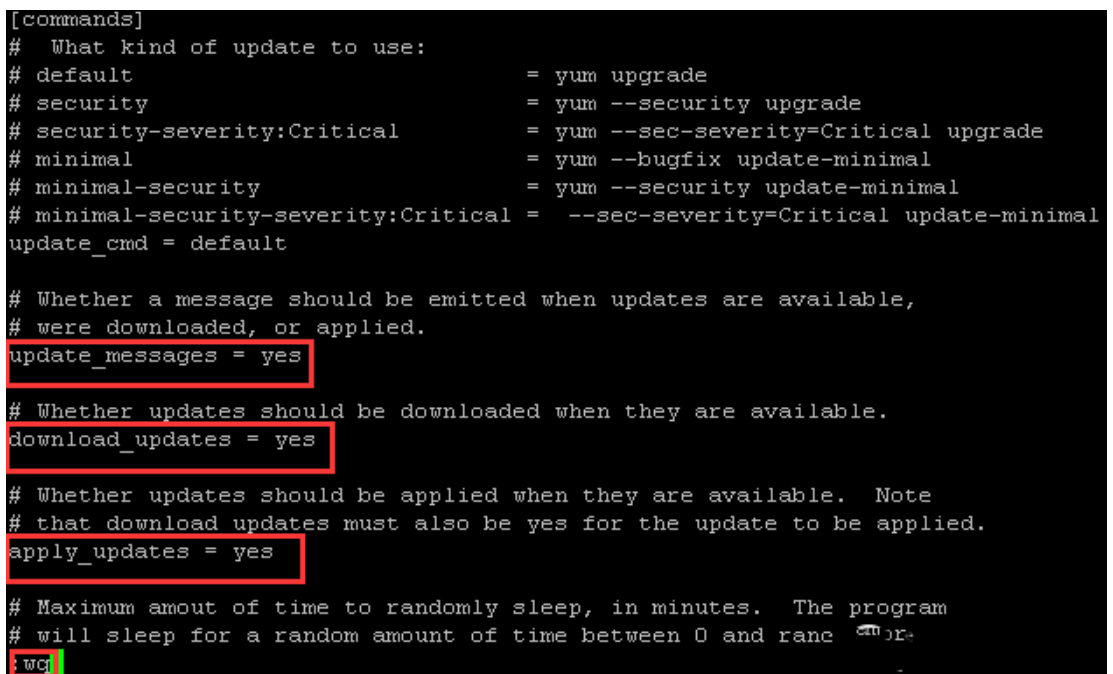 3.按“i”进入插入模式,确认设置update_messages = yes, download_updates = yes, apply_updates = yes,然后按“ESC”键输入wq按回车键保存退出vi编辑