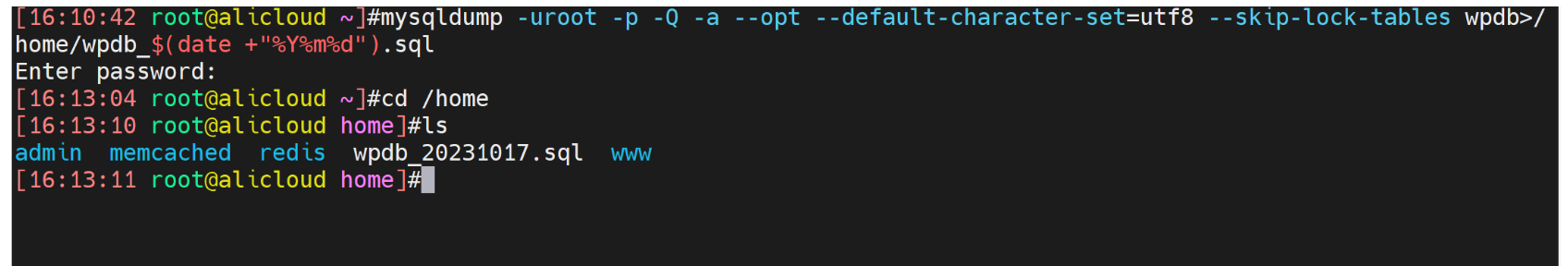 mysqldump -uroot -p -Q -a --opt --default-character-set=utf8 --skip-lock-tablesdbname>/home/dbname_$(date +"%Y%m%d").sql范例: