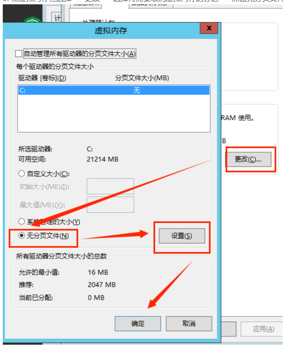 5. 在虚拟内存栏选择 -> 更改 -> 选择将需要取消虚拟内存的分区 -> 点击无分页文件 -> 点击设置 -> 确定