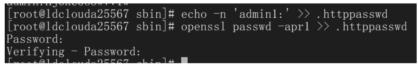 在部分情况下,我们需要对用户身份进行登录认证。我们可以使用 auth_basic_user_file 指定用户名密码文件,该文件我们可以使用如下方法生成: