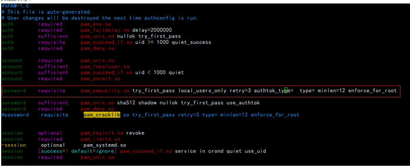 找到该行添加上 authtok_type= minlen=12 enforce_for_root