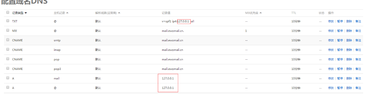 请参考上图DNS配置 将mail.ewomail.cn 改成你的安装的域名,例如(mail.安装的域名) 红色部分请改为你的服务器IP