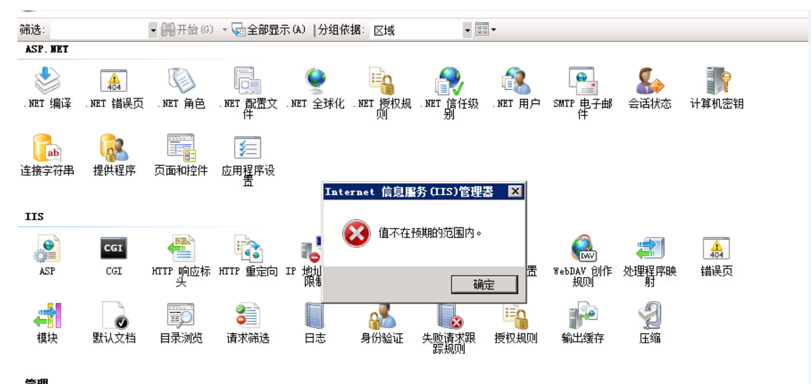 **另一版本出错现象**:win7/8/2008下,原来是framework 2.0的运行正常,后来把网站包括类库升级成4.0框架,在iis里把网站对应的应用程序池对应的框架版本也改成了4.0,再浏览时把不开网页,在iis管理点击右边的启动,弹出错误提示 "值不在预期的范围".