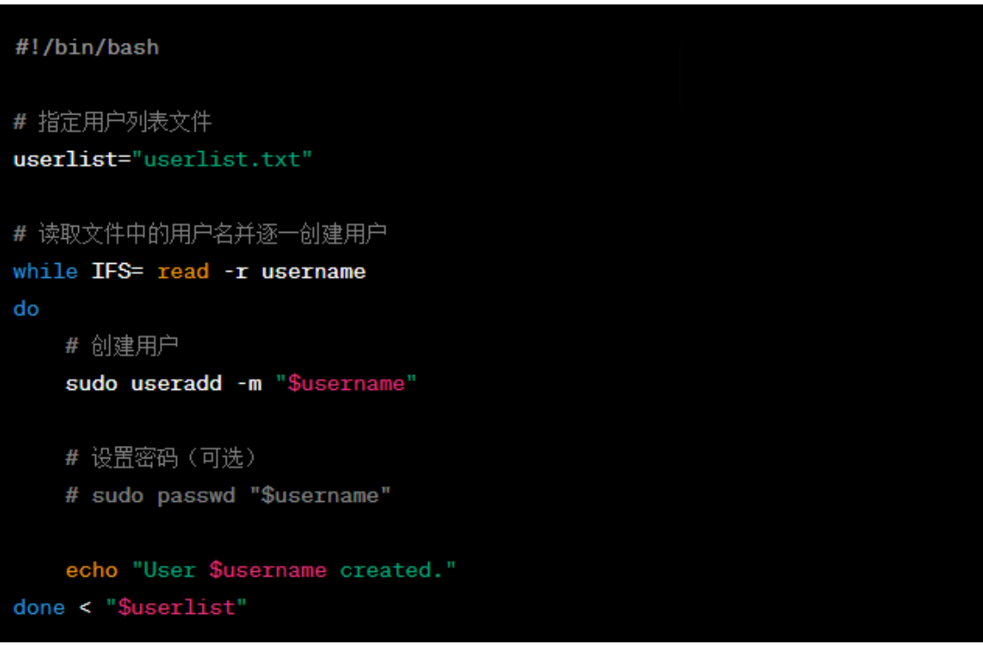 这个脚本将使用userlist.txt文件中的用户名逐一创建用户。您可以取消注释(去掉#)以启用设置密码的部分,以便为每个用户设置密码。