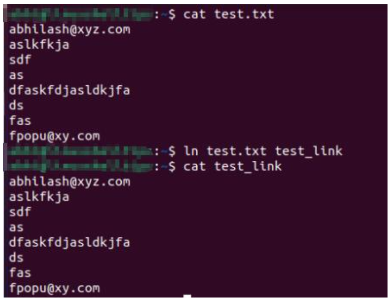 我们可以看到,链接已经创建,而且显示的内容与主文件相同。然而,当我们调用这样的命令时,它会创建一个叫做 "硬链接 "的东西。硬链接指向主文件的 "Inode",因此,即使主文件被移动,它也会保持不变。