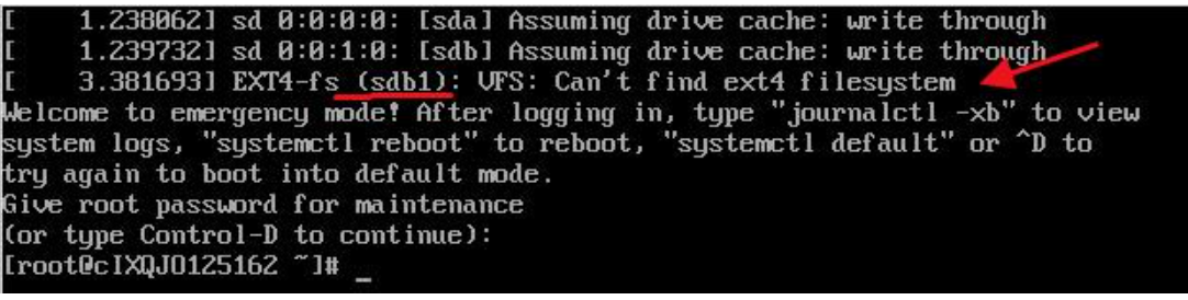 如上图中提示的sdb1(数据盘),没有找到ext4文件系统,这种情况需要注释掉fstab文件中数据盘挂载的配置。