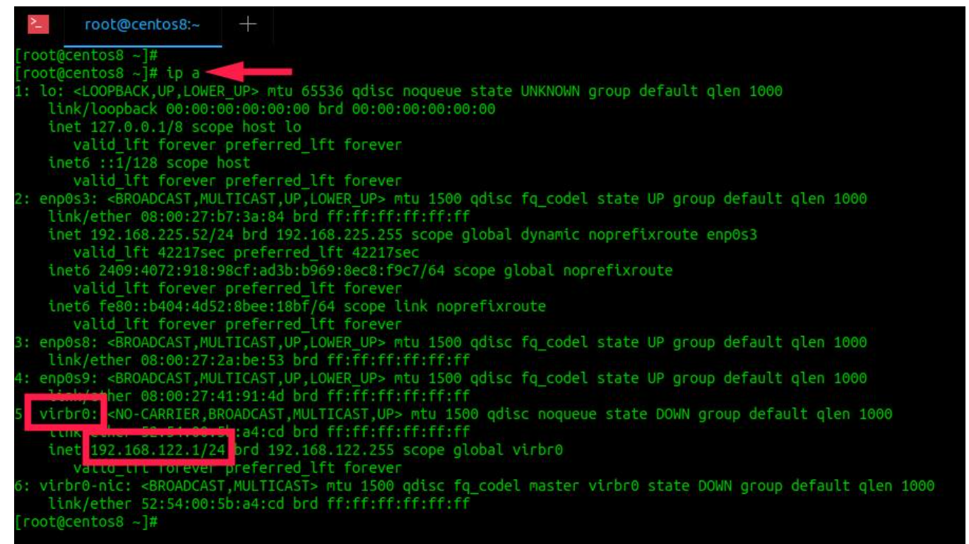 使用“ ip”命令查看KVM默认虚拟接口的IP地址: