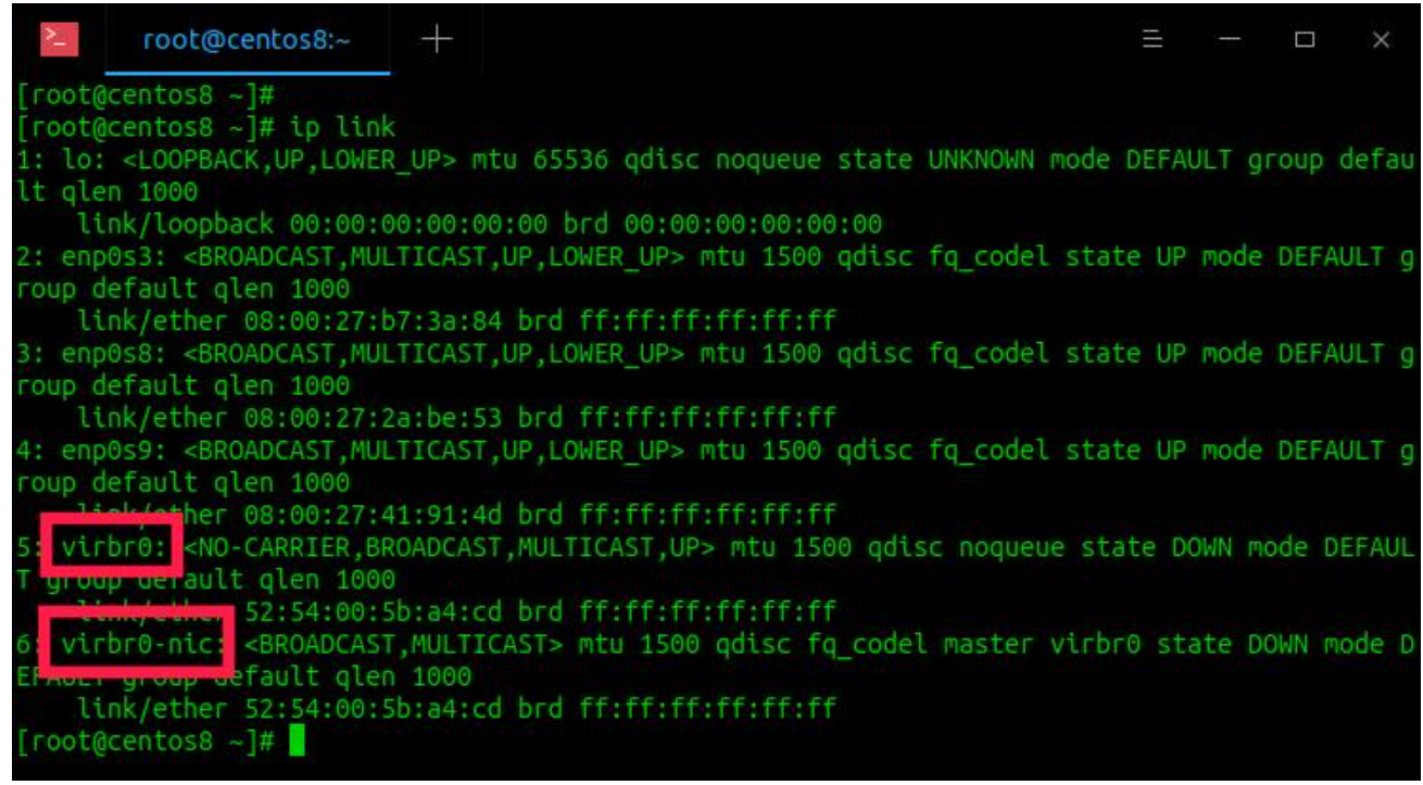 现在再次运行“ ip link”以验证virbr0和virbr0-nic接口是否已被删除: