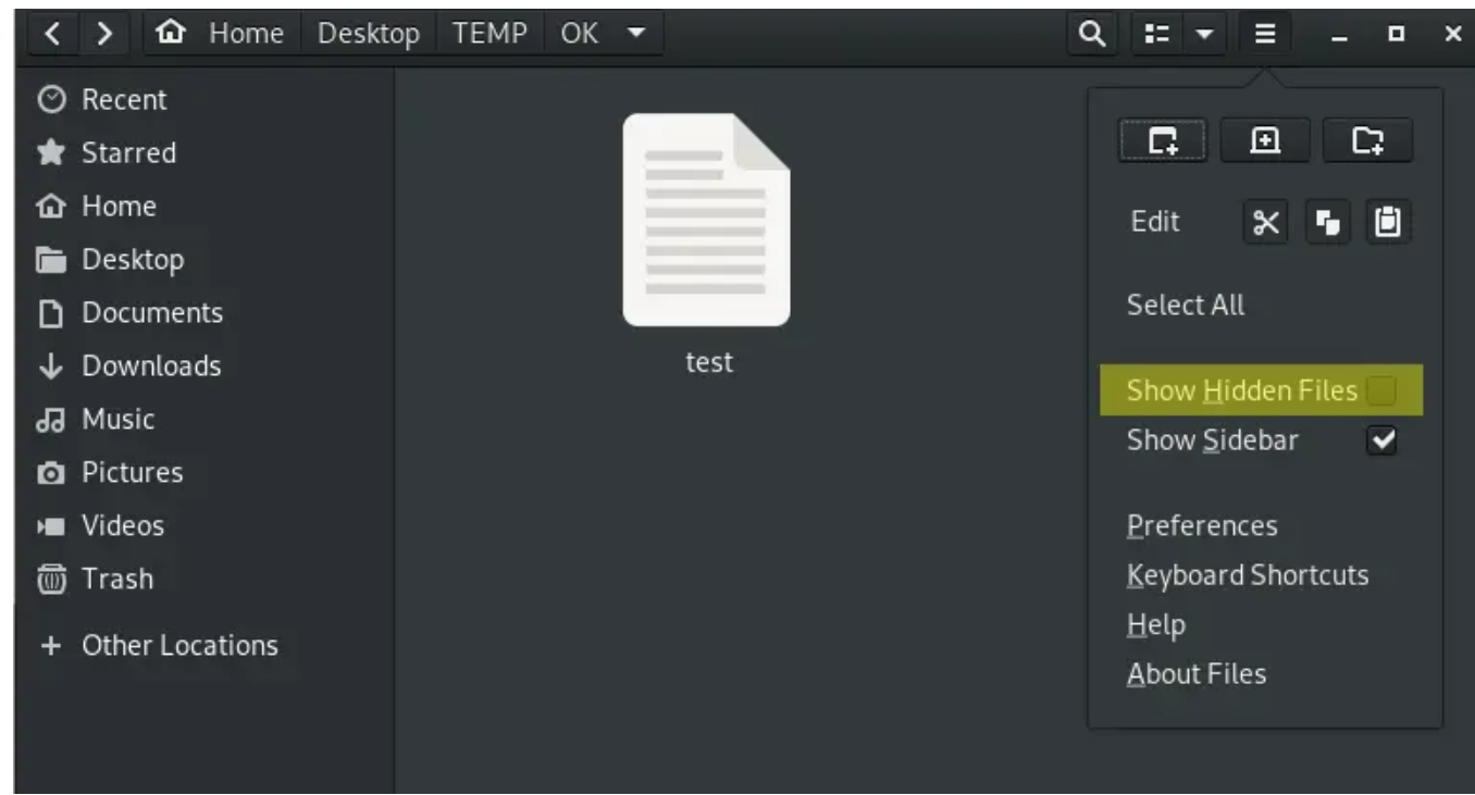 每个文件管理器都略有不同,但是它们都有显示隐藏文件的选项。我们正在使用Gnome文件。在这里,我们可以点击汉堡菜单,然后选择“Show Hidden Files”显示隐藏文件选项。