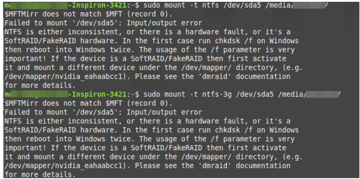 下面的截图显示了一个NTFS挂载失败错误的例子。