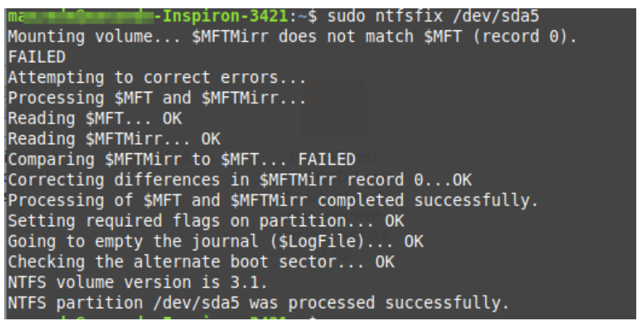 要修复这个错误,你可以使用ntfsfix实用程序,它可以修复一些常见的NTFS问题。ntfsfix是ntfs-3g软件包(NTFS的一个开源实现)的一部分,它可以修复几个基本的NTFS不一致,重置NTFS日志文件,并为第一次启动到Windows中安排NTFS一致性检查。