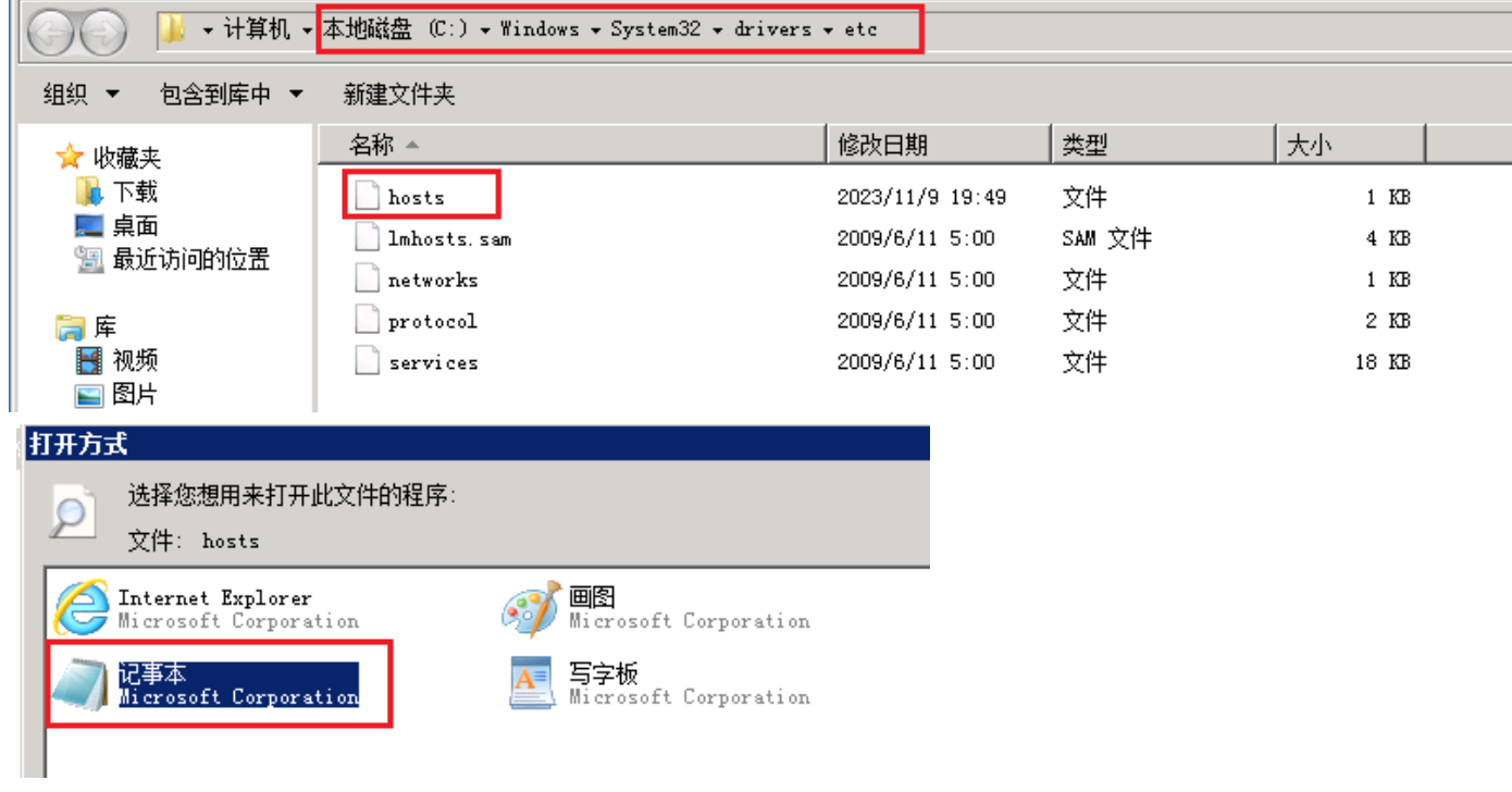 回车后找到hosts文件,双击后选择使用记事本打开