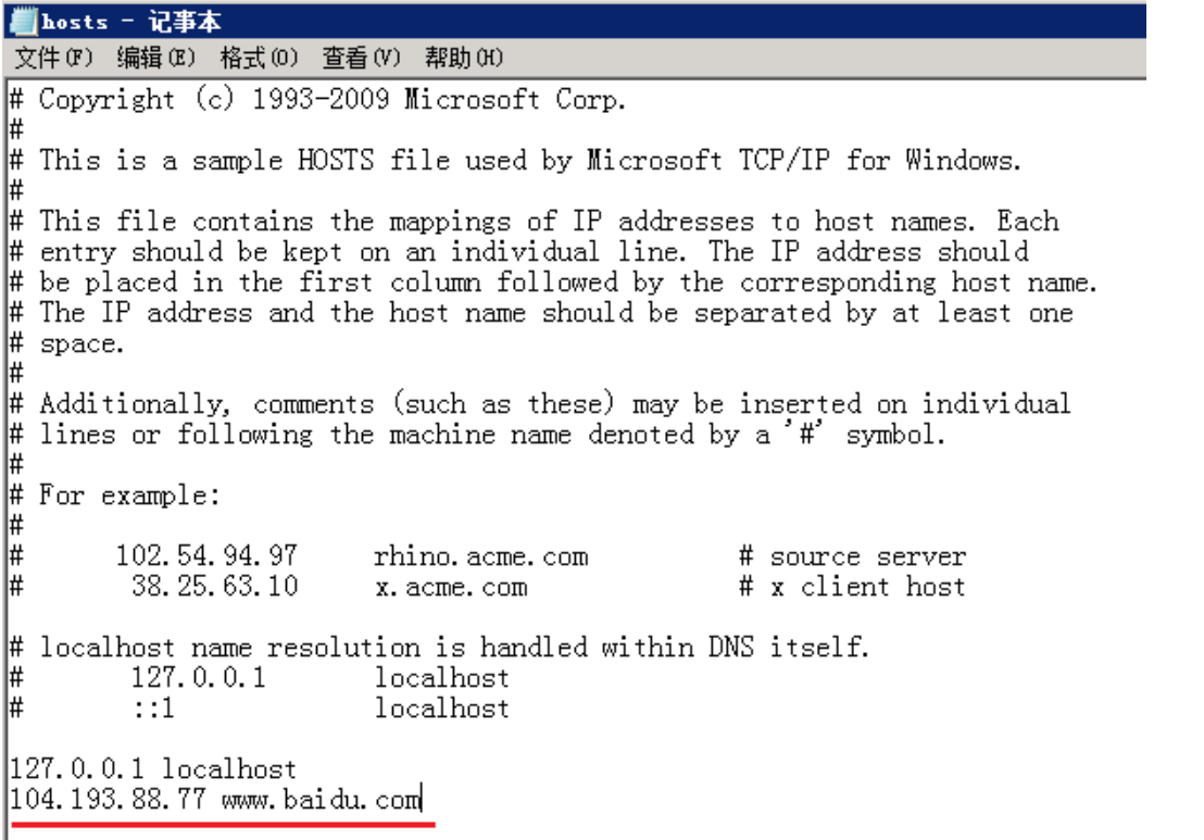 此处例如需要增加一个指定IP访问某域名,直接输入“IP 域名” 后保存文件