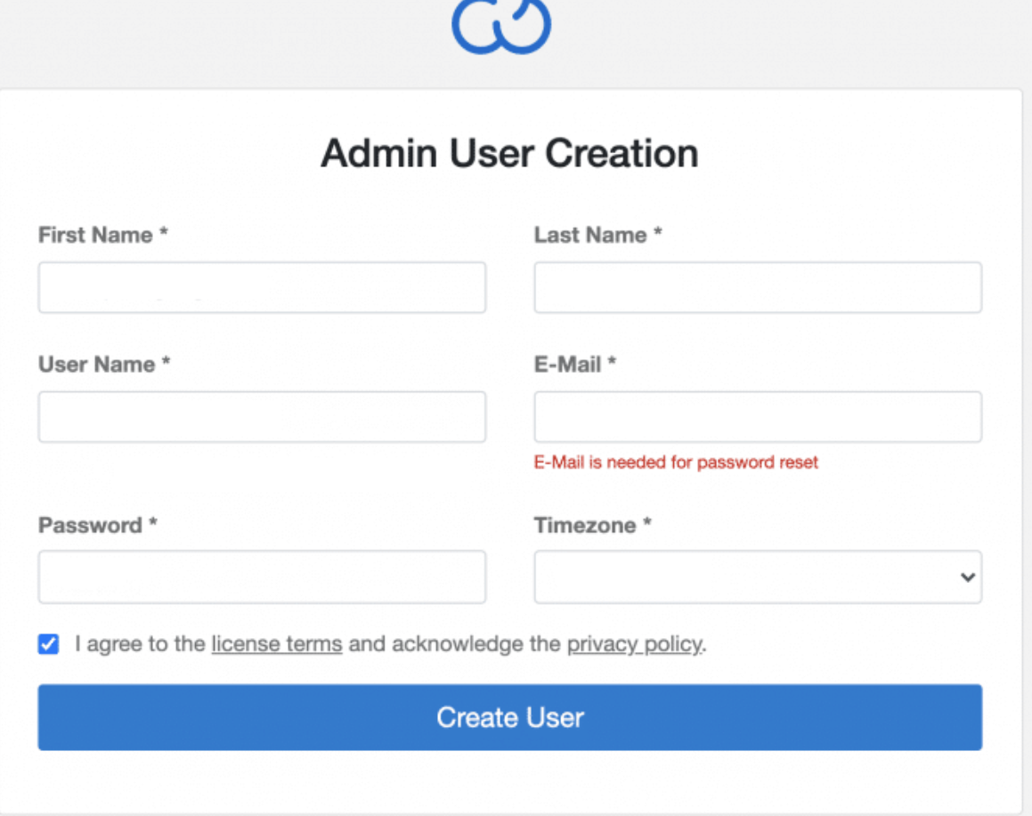 接受SSL警告,因为这是自签名证书,然后创建管理员用户: