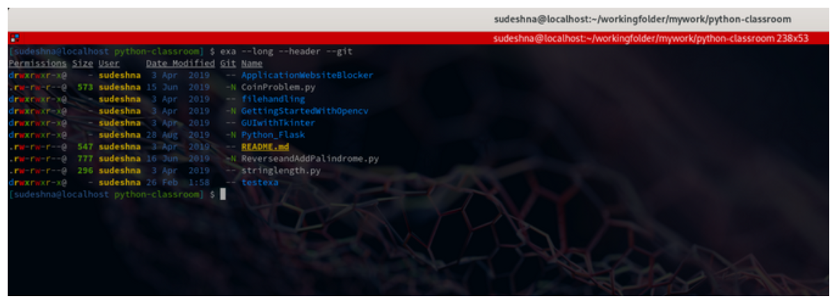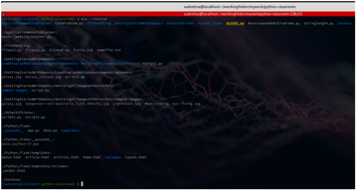 我相信 exa 是最简单、适应性最强的工具之一。它帮助我跟踪了很多Git和Maven文件。它的颜色编码让我更容易在多个子目录中搜索,而且它帮助我了解当前的xattrs。