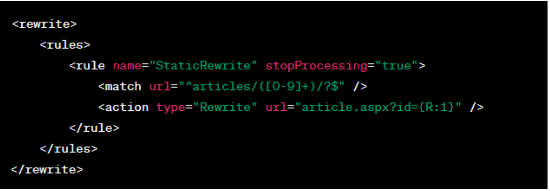 这个规则会将 /articles/123 重写到 /article.aspx?id=123.